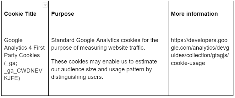 You can find more information about the individual cookies we use and the purposes for which we use them in the table below: